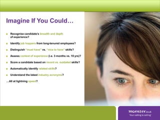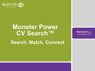 The document describes Monster Power CV Search, a tool that uses natural language processing to understand concepts in resumes rather than just keywords. It can recognize the depth and recency of a candidate's experience, distinguish between required and optional skills, and automatically identify related skills. The tool understands contexts, job titles, industries, and the hierarchy of concepts. It also evaluates the length of time a candidate has spent in roles or using skills. The document claims the tool finds qualified candidates faster and saves recruiters significant time over traditional keyword searches.