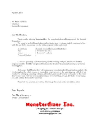 The document is a proposal from Monsterdizer Inc. for event planning services for the Summit Musical Instrument Tradeshow to be held on December 20, 2014 at Robinson's Galleria in Manila. It outlines key event details such as the venue, date, proposed budget, and Monsterdizer's qualifications and team. If hired, Monsterdizer would handle all aspects of event planning including coordination of vendors, attendees, marketing and logistics to ensure a successful tradeshow.