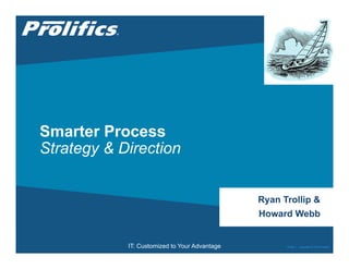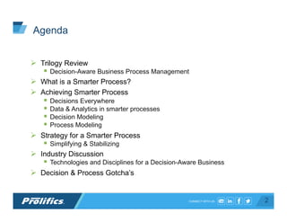 The document discusses achieving smarter processes through decision modeling and analytics. It begins with an overview of decision-aware business process management and what constitutes a smarter process. It then covers key aspects of achieving smarter processes including embedding decisions throughout, leveraging data and analytics, decision modeling, and process modeling. The presentation emphasizes strategies for simplifying and stabilizing processes through decision modeling and operationalizing decisions and analytics.