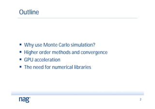 The document discusses the implementation of Monte Carlo simulation, emphasizing its importance for high-dimensional problems and applications with uncertainty, particularly in finance. It highlights advancements in GPU acceleration and higher order methods to improve performance on multi-core architectures. The text also covers numerical libraries that facilitate GPU use for Monte Carlo simulations and showcases examples of successful applications by financial institutions.