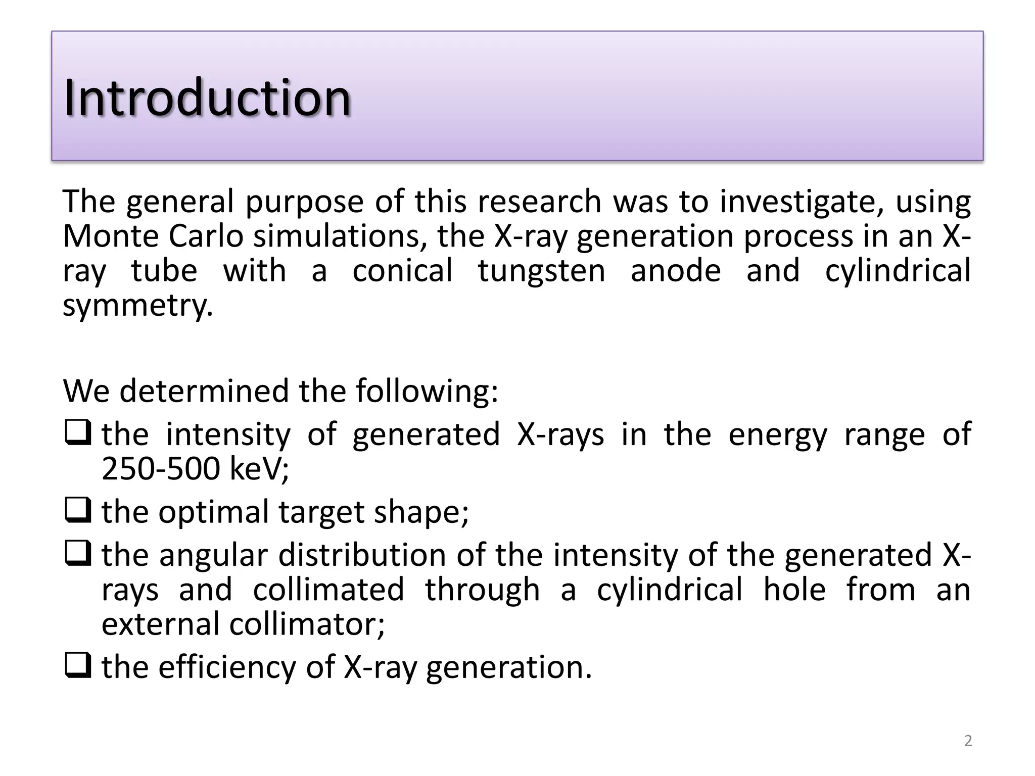 This research utilizes Monte Carlo simulations to analyze x-ray generation in a conical anode-type x-ray tube, focusing on aspects such as x-ray intensity, optimal target shape, and angular distribution. The study explores various parameters including electron energy and collimator design to determine effective x-ray production. Key findings include the dependence of collimated x-ray intensity on the apex angle of the anode and electron beam radius.