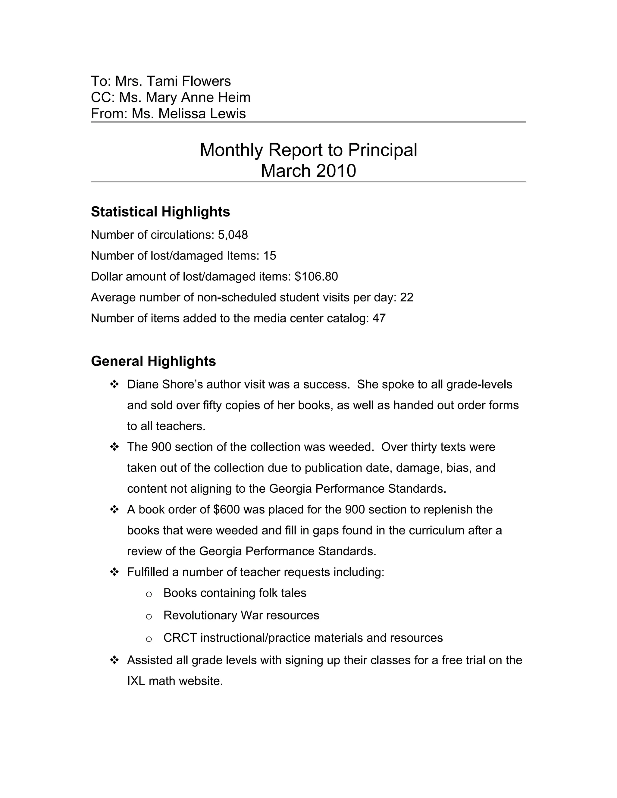 The media center had 5,048 circulations and 15 lost/damaged items costing $106.80 in March. An author visit was successful and the 900s section was weeded, removing 30 texts. A $600 order was placed to replenish the 900s section. The librarian fulfilled teacher requests, assisted with math website trials, distributed a reference wiki, and remodeled the website. Future plans include collaborating on units, implementing wiki professional development, and rearranging the non-fiction section.