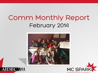 The document provides monthly reports from various departments of an organization in February 2014. Communications focused on marketing campaigns and educating networks. Finance delivered a conference and drafted a financial model. PR prepared for conferences and invited speakers. External Relations managed career events and product development. Overall factors that influenced performance included conferences, workload, and short time periods between projects. Key priorities for March included additional campaigns, conferences, and developing leadership programs with time constraints noted as challenges.