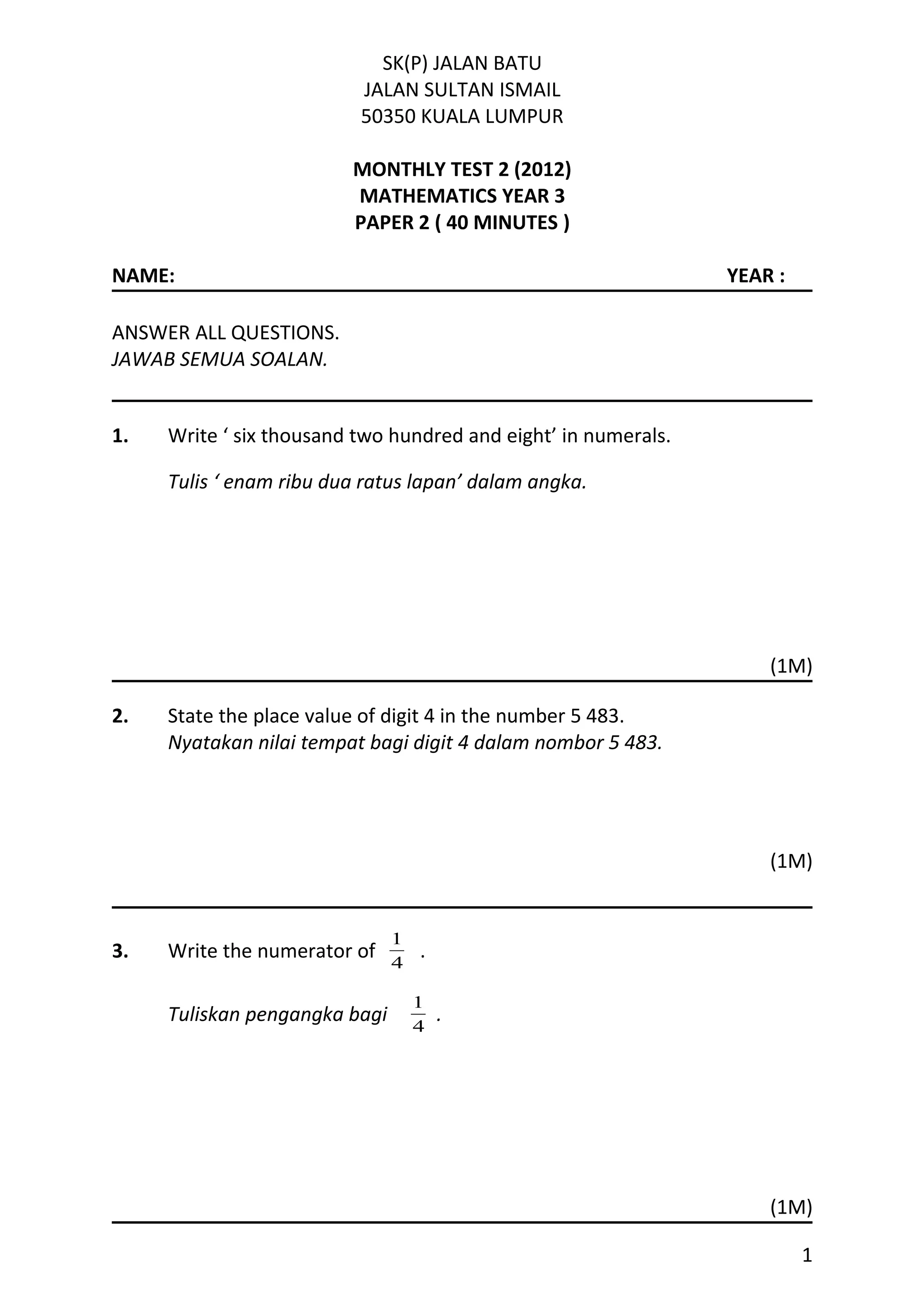 Dokumen ini adalah kertas ujian matematik untuk tahun 3 yang mengandungi pelbagai soalan dalam bahasa Melayu dan Inggeris. Ia meliputi topik seperti penukaran unit, operasi matematik asas, nilai tempat dan pengiraan matematik lain. Pelajar dikehendaki menjawab semua soalan dalam masa 40 minit.