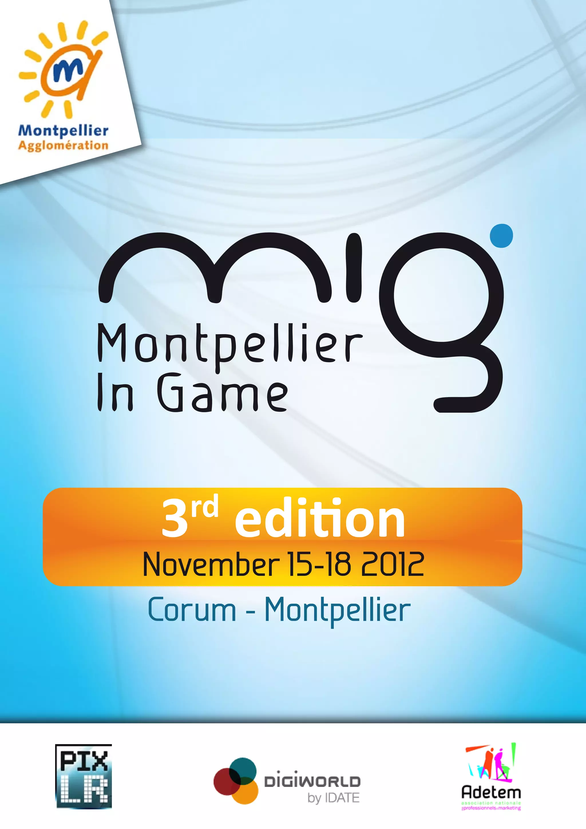 The 3rd edition of the Montpellier In Game (MIG) will take place from November 15-18, 2012 at the Corum in Montpellier. The event brings together video game professionals for conferences over two days, followed by a public video game festival over the weekend. In 2012, MIG expects over 5,000 square meters of entertainment space, 1,500 competing gamers in tournaments, meetings with notable game creators, and over 40 exhibitors. The goal is to make MIG one of the major gaming events in France.