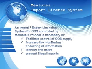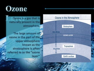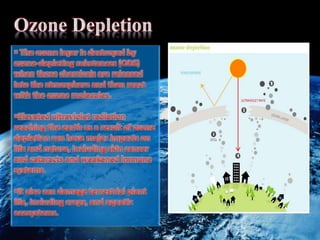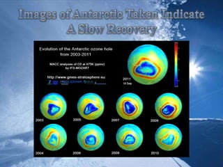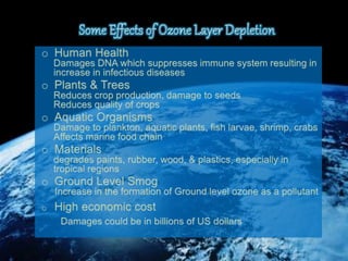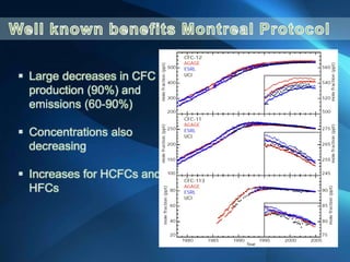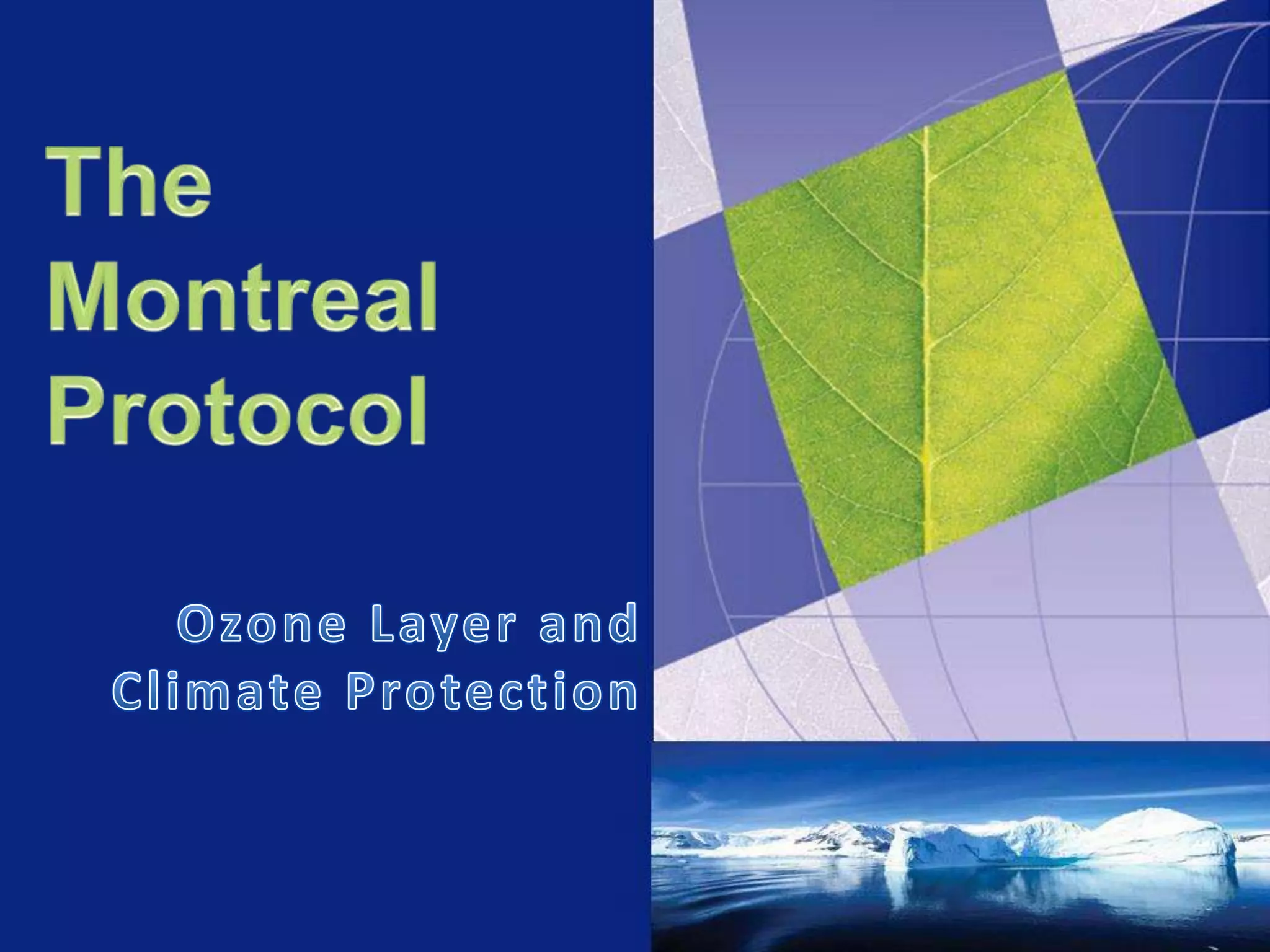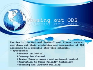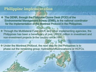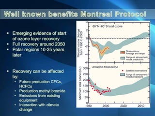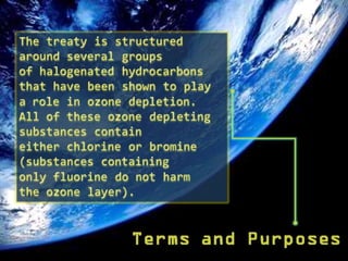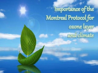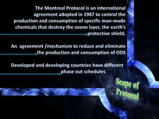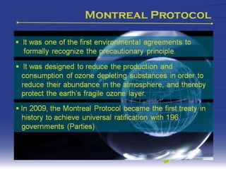 The document summarizes the Montreal Protocol, an international treaty signed in 1987 to protect the ozone layer by phasing out the production of numerous substances that are responsible for ozone depletion. Key details include that it has been ratified by 197 countries, requires staged reductions in CFC production and consumption through complete phase-outs by specific years, and has been hailed as one of the most successful international agreements due to evidence that it is repairing the ozone layer and providing significant climate benefits by avoiding greenhouse gas emissions.