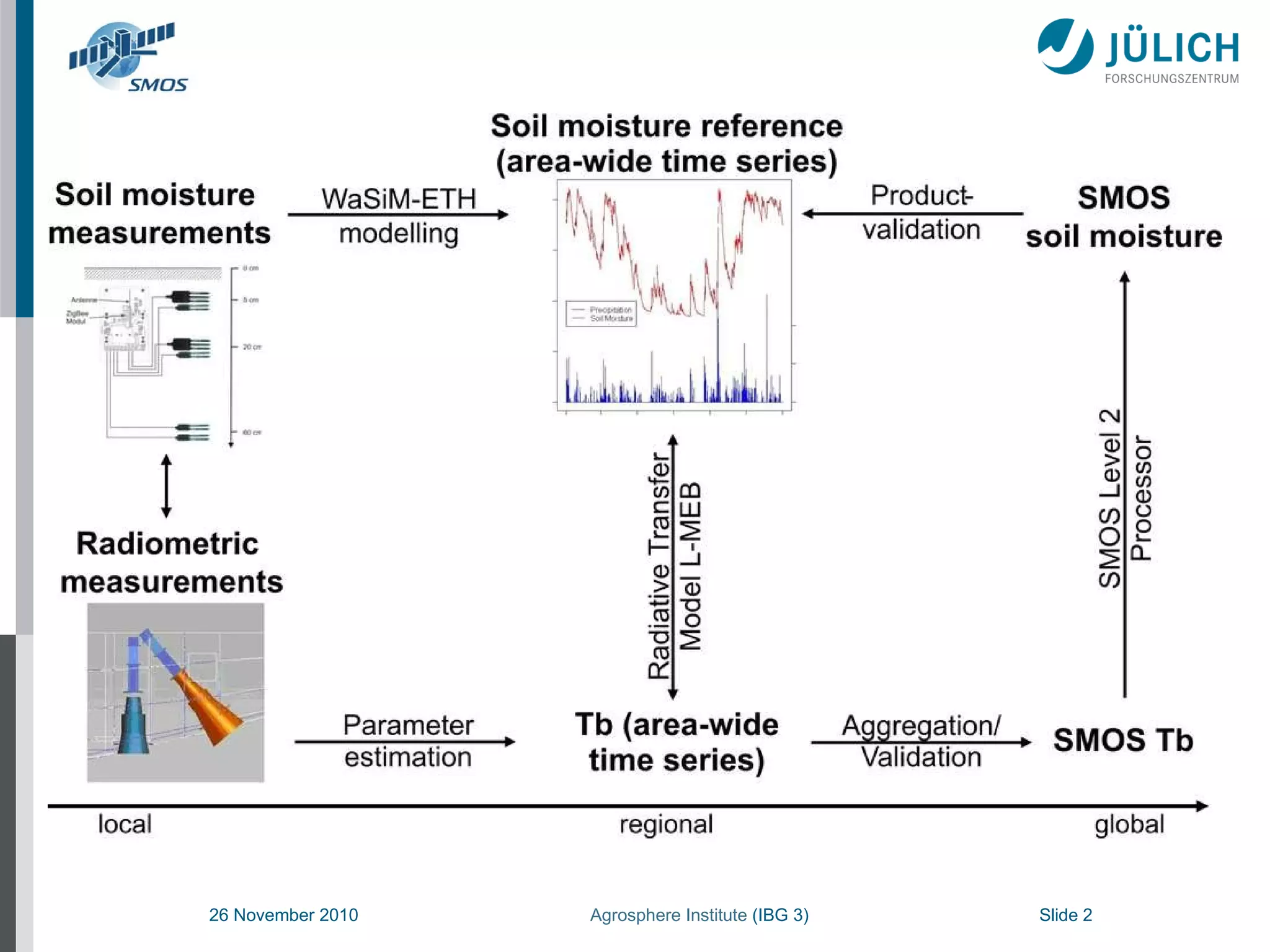 2. Ground-based, airborne, and satellite L-band radiometer measurements were taken at different agricultural and forest test sites and used to estimate soil moisture and validate SMOS satellite brightness temperature measurements.