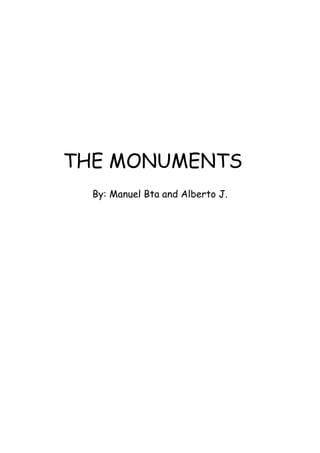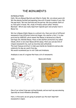 This document summarizes several important monuments in Spain, including the Cathedral of León, the Aqueduct of Segovia, La Alhambra in Granada, the City of Arts and Sciences in Valencia, the Sagrada Familia in Barcelona, the Mosque–Cathedral of Córdoba, La Giralda in Seville, and several castles across Spain. The monuments showcase different architectural styles ranging from Gothic to Islamic and date from Roman times to the modern era. Many are UNESCO World Heritage Sites and among the most visited sites in Spain.