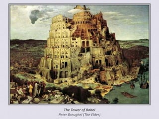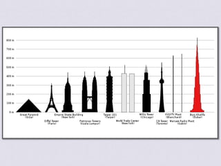 This document contains images and information about famous towers and skyscrapers from around the world that represent human ambition and achievement, including the Tower of Babel, Great Pyramid of Giza, Eiffel Tower, Empire State Building, Petronas Towers, Taipei 101, Burj Khalifa, and Willis Tower. It also includes quotes about the dangers of conceit and arrogance. The document was created by Anna and contains photos downloaded from websites along with music by E. Cortazar.