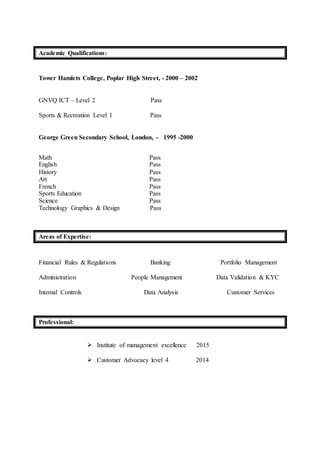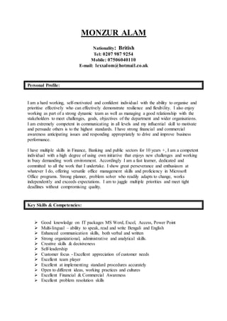 This document contains a profile for Monzur Alam, including his contact information, personal profile, key skills, qualifications, areas of expertise, professional experience, employment history and references. Alam has over 10 years of experience in finance, banking and the public sector. He has strong skills in areas like administration, people management, data analysis and customer service. Alam is highly organized, a strong communicator and team player, and able to effectively manage multiple priorities and meet deadlines.