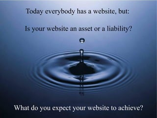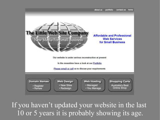 The document discusses the importance of having an updated website as an asset for businesses, highlighting how outdated websites can impede success. It introduces Moochoo as a solution for small businesses looking to refresh their web presence, offering services such as content migration, custom design, and ongoing support. The standard package includes domain registration, hosting, and additional features to enhance the website's functionality.