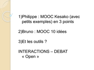 This document summarizes a presentation about Massive Open Online Courses (MOOCs). It discusses the origins and evolution of MOOCs, including early examples from 2008. It also outlines different types of MOOC platforms and tools that can be used to create interactive course content and evaluations. The document provides examples of open educational resources and the open sourcing of MOOC software.