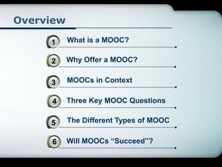 The document provides an extensive overview of Massive Open Online Courses (MOOCs), tracing their origins and evolution while outlining their potential impact on educational delivery. It emphasizes the significance of quality teaching and innovative pedagogies for the success of MOOCs, discusses various types such as cMOOCs, xMOOCs, and sMOOCs, and highlights their differing pedagogical approaches and business models. Additionally, the document raises concerns about the sustainability and integration of MOOCs in traditional education systems while exploring institutional strategies for leveraging MOOCs to enhance accessibility and educational experimentation.