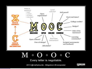 The document discusses MOOCs (Massive Open Online Courses) as a transformative force in higher education, highlighting their ability to provide free access to courses from prestigious universities. It explores the implications for libraries and librarians, emphasizing the need for collaboration, support for MOOC learners, and the development of course-specific guides. The conclusion suggests that embracing MOOCs can enhance librarianship and the quality of library and information science education.