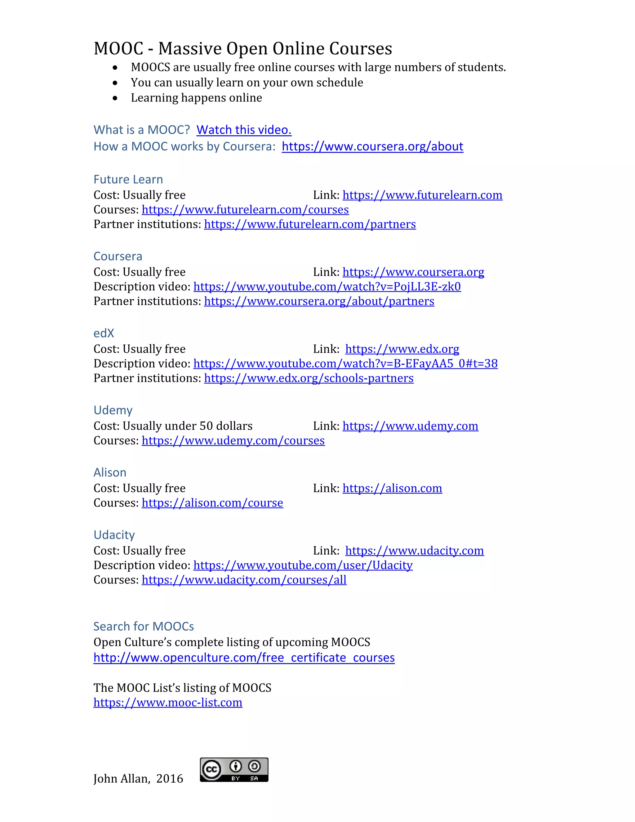 MOOCs are free online courses that have large numbers of students who can learn on their own schedule. The document discusses several major MOOC platforms like Coursera, edX, FutureLearn, Udacity and Udemy that partner with universities to offer free online courses on a variety of topics. It also provides links to search for upcoming MOOCs on sites like Open Culture and MOOC List.