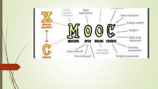 This document provides an overview of Massive Open Online Courses (MOOCs). It discusses the history and origins of MOOCs, tracing them back to 2004. It outlines two main types of MOOCs - cMOOCs which emphasize openness, connections, and collaboration, and xMOOCs which have a more formal structure. The document also examines the pros and cons of MOOCs, noting that they provide free or low-cost access to courses but can lack real-world engagement. It concludes by stating that the presenter is interested in life sciences MOOCs that allow sharing ideas between peers and experts.