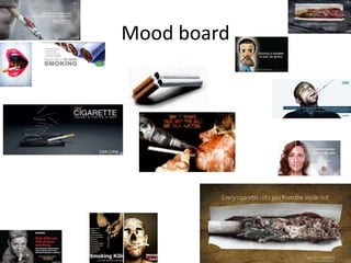 The document discusses creating a mood board and mind map that uses negative space, black and red colors, and a large image. It suggests including statistics, a picture of someone smoking, and a drawn illustration or depictive image.