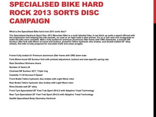 The document discusses the Specialized Hardrock Sport Disc 2013 mountain bike. It has a fully butted aluminum frame, SR Suntour suspension fork with 80mm of travel, Tektro hydraulic disc brakes, and double-walled alloy wheels, making it suitable for both mountain trails and urban areas. It has 24 speeds and a drivetrain that includes a Shimano Acera rear derailleur and SR Suntour triple chainset. The document also mentions using nature and woodland settings for photography and videos to showcase the bike's capabilities off-road.