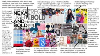 The document discusses design choices for a music magazine, including font selection, image placement, use of bright colors, and layout designs. Various magazine pages, covers, and contents pages are evaluated for elements like masthead color, pull quotes, and background hues that make key information pop visually or create an appealing aesthetic matching the magazine's music theme.
