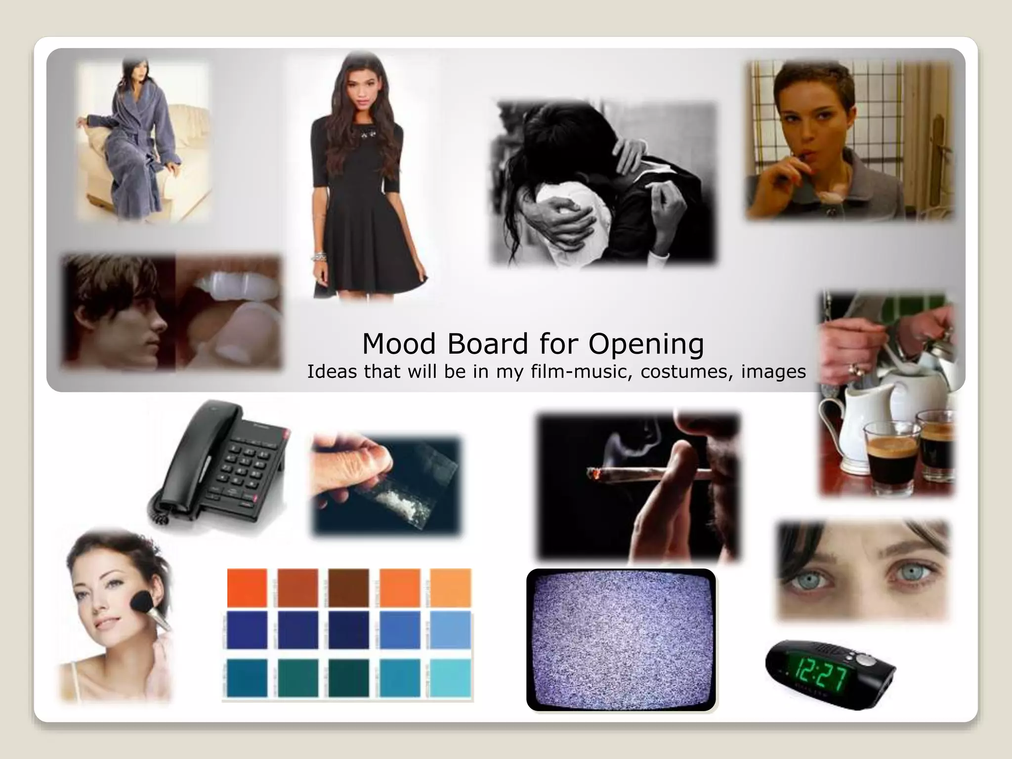 This mood board is for an opening and includes ideas for music, costumes and images that will be featured in the film. It aims to convey the overall tone and aesthetic that will be presented at the start through sensory elements like sound, appearance and visuals. In 3 sentences or less, the document outlines planning for setting the scene and tone at the beginning of a movie through various artistic elements.