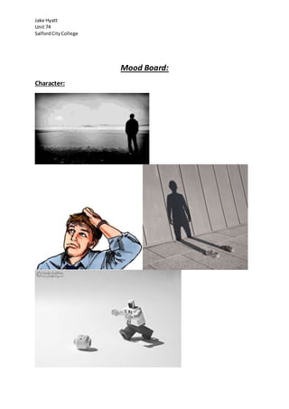This mood board document contains 3 sections - Character, Environment, and Objects. Each section is labeled but contains no other information beyond the header, suggesting this is an outline for a future mood board rather than a completed one.