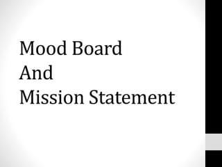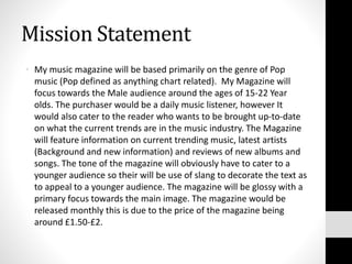 The document provides a mission statement and mood board for a proposed music magazine. The mission statement indicates that the magazine will focus on pop music and target male readers ages 15-22. It will feature information on trending music, artists, and new album/song reviews in a tone that appeals to younger readers. The mood board shows that the target audience listens to pop music on Spotify, is 70% male and 30% female, and has interests including fashion and video games.