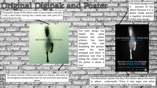 The document provides ideas for the graphic design of an album cover and tour poster. It suggests creating a double exposure effect by photographing band members against a white wall and overlaying an image of a building. Another idea is to use a smoke effect to represent the themes of the song by showing a person fading away. A more traditional approach of having the band stand together could also work. Representing the album title "Six Billion" through a minimalist design showing one person among billions is another option discussed.