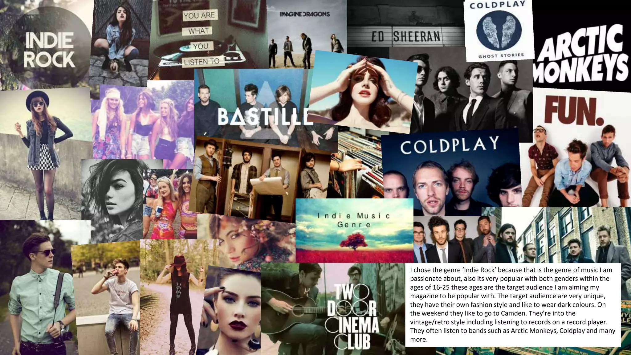 The document discusses a proposed indie rock music magazine targeted at 16-25 year olds. The magazine will focus on indie rock music, which is popular with the target audience. It will feature artist interviews, profiles on fans and their social media influence, and information on upcoming concerts. The magazine will be published monthly and use bold fonts and dark colors to appeal to the target audience's unique fashion style. It will include a free demo CD from one of the featured artists in each issue.