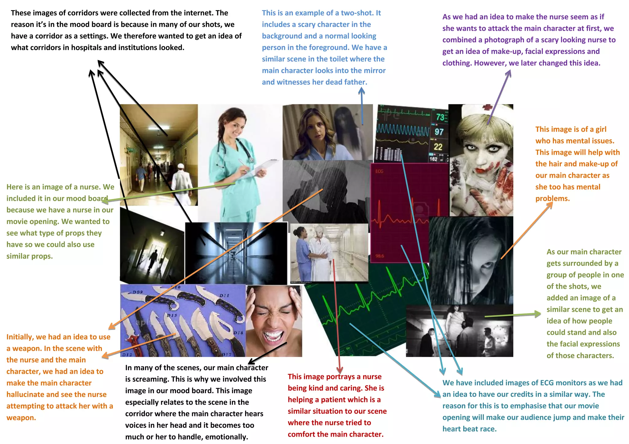 This document discusses images included in a mood board for a film project. It includes photos of hospital corridors, medical equipment, characters portraying nurses and patients, and scenes depicting crowds and screaming. The images were selected to help inform the design of settings, costumes, props, character expressions and specific scenes in the film involving a main character with mental health issues interacting with medical staff.