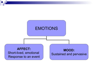 Mood disorders are characterized by a sense of loss of control over one's mood and subjective distress. They include conditions like bipolar disorder and recurrent depressive disorder. Bipolar disorder involves alternating periods of mania and depression, while recurrent depressive disorder involves two or more episodes of major depression. Core features of mania include elevated or irritable mood, increased speech, decreased need for sleep, and increased psychomotor activity, while depression is marked by depressed mood, anhedonia, and loss of energy. Treatment involves mood stabilizers, antipsychotics, benzodiazepines, antidepressants, or electroconvulsive therapy. Prognosis depends on factors like age of onset, duration of episodes, and presence of psych