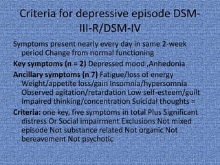 The document summarizes classification systems and diagnostic criteria for various mood disorders according to the ICD-10 and DSM-III-R/DSM-IV, including major depressive disorder, dysthymic disorder, mixed anxiety-depressive disorder, bipolar disorder, and discusses epidemiology, symptoms, and treatment options.