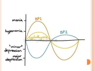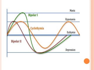 2. The document discusses the clinical features, classification, etiology, and nursing management of mood disorders with a focus on manic episodes and depressive episodes. Core features of mania include elevated mood, increased speech and activity, and decreased sleep while features of depression include depressed mood, loss of interest, and changes in appetite and sleep.