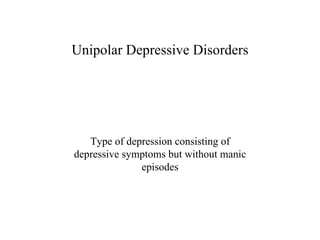 The document discusses mood disorders including unipolar depressive disorders, symptomatology of depressive disorders, DSM-IV categories of unipolar depressive disorders, subtypes of depression, bipolar disorder, gender and age differences in depression, the course of depression, and biological theories of mood disorders.