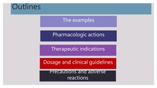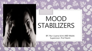 This document outlines mood stabilizers, including lithium, valproate, carbamazepine, and antipsychotic agents. It discusses their pharmacologic actions, therapeutic indications, dosages, guidelines, and precautions. Mood stabilizers are used to treat bipolar disorder and other conditions by decreasing the frequency and severity of manic and depressive episodes. Key precautions include risks during pregnancy, adverse effects like weight gain and liver toxicity, and the need for monitoring. Mood stabilizers are an important treatment option for bipolar disorder but require awareness of safety considerations.