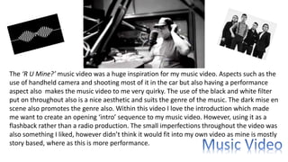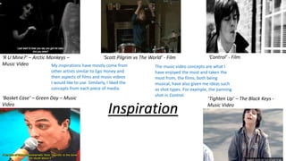 This document discusses the artistic inspirations for a music video project. It summarizes several music videos and films that influenced the creator's concepts and shooting style. The Arctic Monkeys' "R U Mine?" video inspired the use of handheld camerawork and a quirky performance aspect. Scenes from "Scott Pilgrim vs The World" provided ideas for comic book-style subtitles and close instrument shots. The black and white cinematography and one-shot style of "Control" were also influential. Green Day's "Basket Case" inspired the addition of filters and dreamlike crossfades. Finally, the children and soft focus of The Black Keys' "Tighten Up" informed the planned introduction. Overall, the