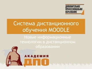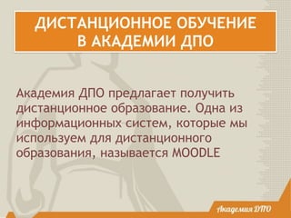 Документ описывает систему дистанционного обучения Moodle, которая используется для обучения по всему миру. Moodle представляет собой бесплатную систему электронного обучения, доступную через интернет и работающую в различных браузерах. Основные возможности включают учебные материалы, тесты для самоконтроля и итоговые экзамены, что обеспечивает гибкость обучения в удобном для пользователя режиме.