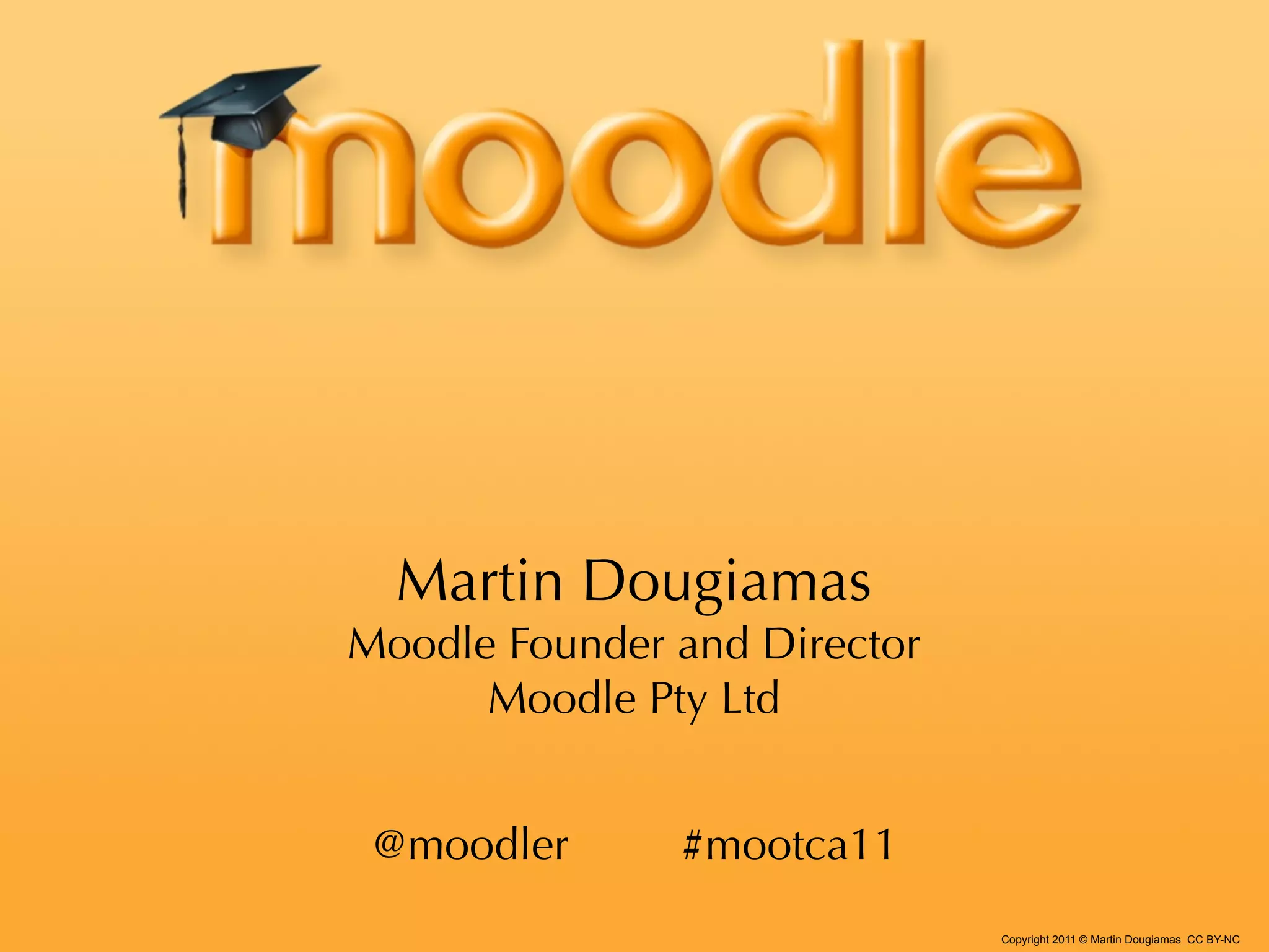 The document summarizes statistics about Moodle usage, provides examples of organizations using Moodle, and outlines Martin Dougiamas' vision and roadmap for ongoing development of the Moodle learning management system (LMS). Over 54,000 sites in 212 countries use Moodle, containing 41 million users, 4.4 million courses and 1.1 million teachers. Future plans include improvements to grading, competency tracking, mobile apps, and integration with other systems.