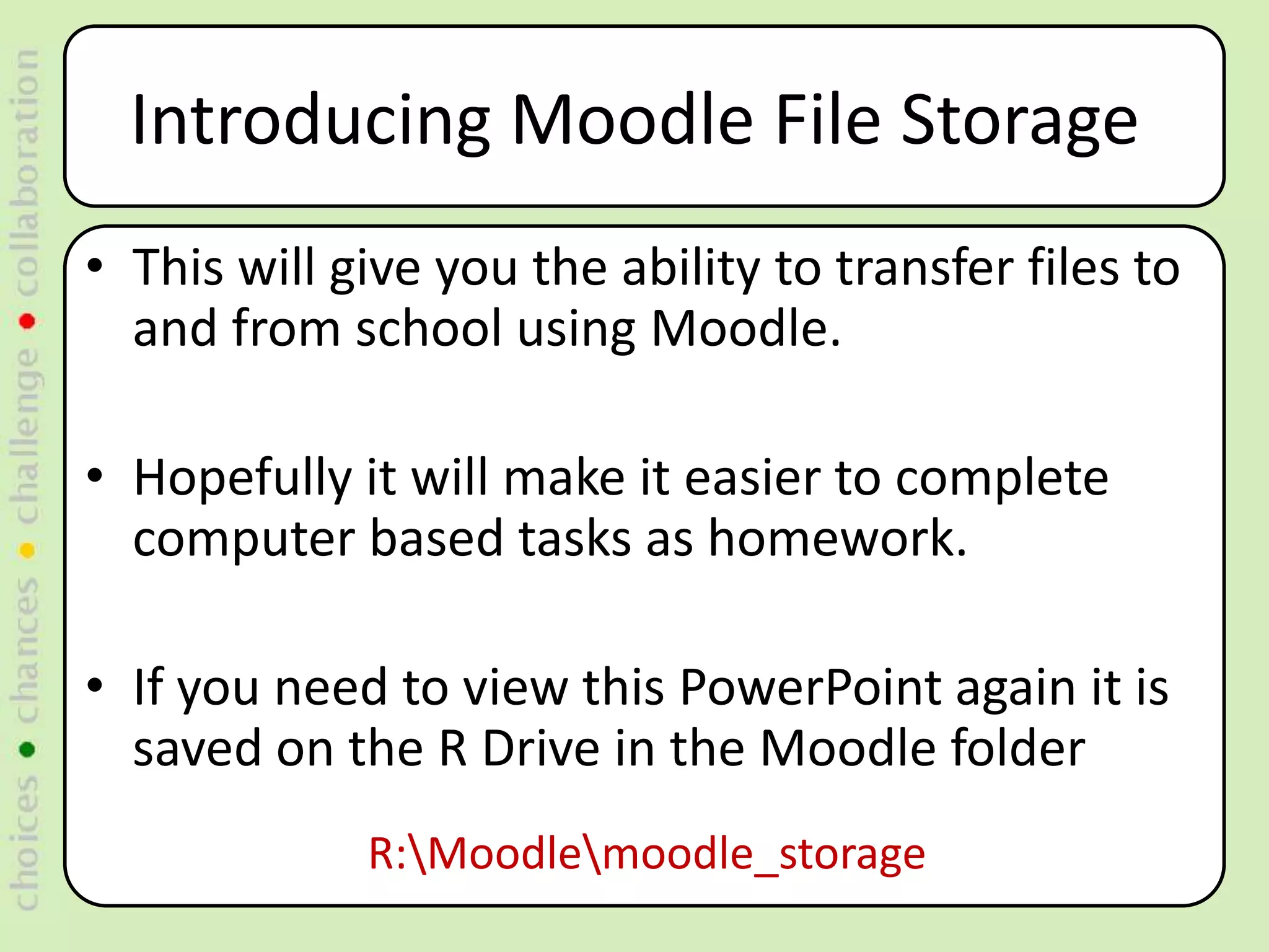 This document introduces Moodle file storage, which allows students to transfer work files between school and home using Moodle. It provides instructions on how to access and use the file storage system by logging into Moodle and clicking on the file storage link. Students can then browse and select files on their computer to upload, and uploaded files can be opened on other computers by logging into Moodle. Notes are also used to add text reminders or information about files. The file storage is only intended for transferring school work, and misuse may result in investigation or sanctions.