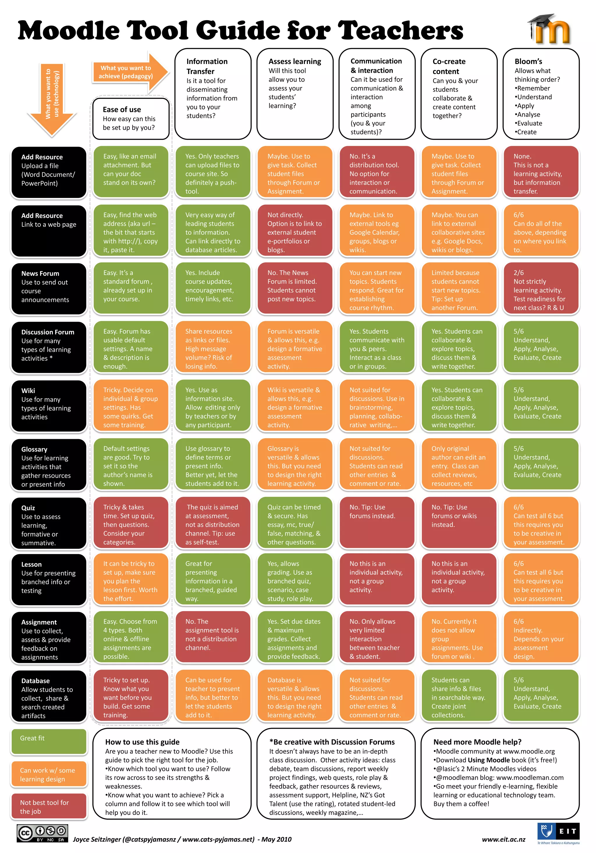 This document is a guide for teachers on using Moodle tools to enhance learning and communication. It outlines various tools available, their purposes, ease of use, and how they can facilitate collaborative learning and assessment. Additionally, it provides tips on choosing the right tool based on desired outcomes and includes resources for further support.