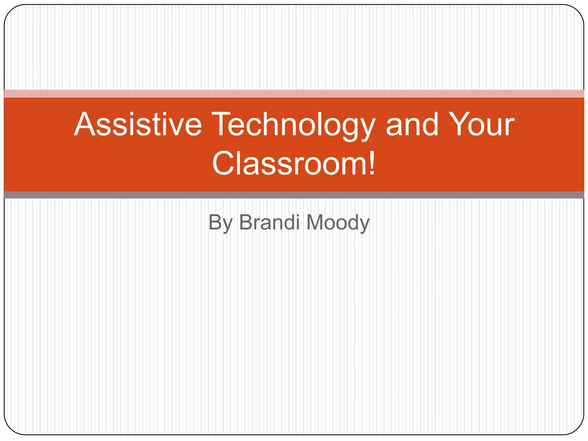 The document discusses how assistive technology can help students with disabilities thrive in the classroom. It defines assistive technology as any technology that helps overcome disabilities, and provides examples such as hearing aids and wheelchairs. The document then lists different assistive technologies and accommodations that teachers can use to help students with specific disabilities or needs, such as hearing impairments, visual learning styles, ADHD, visual impairments, and absenteeism. It encourages teachers to utilize technologies like speech-to-text, FM systems, ebooks, videos, and Google platforms to aid different types of students.