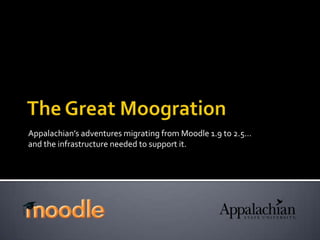 Appalachian State University migrated their Moodle LMS from version 1.9 to 2.5 between 2012-2013 which required upgrading infrastructure to support increased usage and new features. They conducted load testing and moved to a virtualized server farm with load balancers. Supporting both versions caused issues and backup/restore was problematic. Most users adopted the new version which had improved mobile experience and new tools despite some initial interface difficulties.