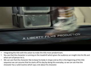 The document discusses shots that could be used in a movie title sequence to characterize the main character. It analyzes shots of the character running on a treadmill alone at night to establish a solid daily routine. It then discusses the character using special equipment for a dangerous job, showing he is a professional. Finally, it discusses shots of the character alone on the moon surface, highlighting the dangers and solitary nature of his work.