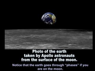 The document discusses evidence that supports the collision theory of lunar formation, in which an object the size of Mars collided with Earth, ejecting material that formed the moon. Key evidence includes the moon's similar surface composition to Earth's crust and mantle, the lack of an atmosphere due to the force of the impact, and similar oxygen atoms between Earth and the moon that are different from other celestial objects. The document also provides an overview of Apollo missions to the moon and features observed like maria, highlands, and craters.