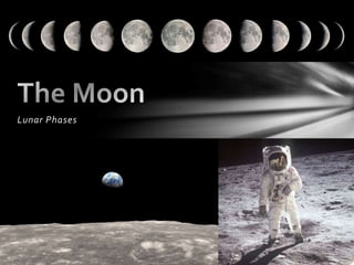 The document discusses lunar phases and what causes them. It explains that moon phases are caused by the changing positions of the sun, earth, and moon relative to each other. As a result, we can only see certain lit parts of the moon from earth. There are 8 main phases - new moon, waxing crescent, first quarter, waxing gibbous, full moon, waning gibbous, third quarter, and waning crescent - that each occur over the course of about a week as the moon orbits earth.