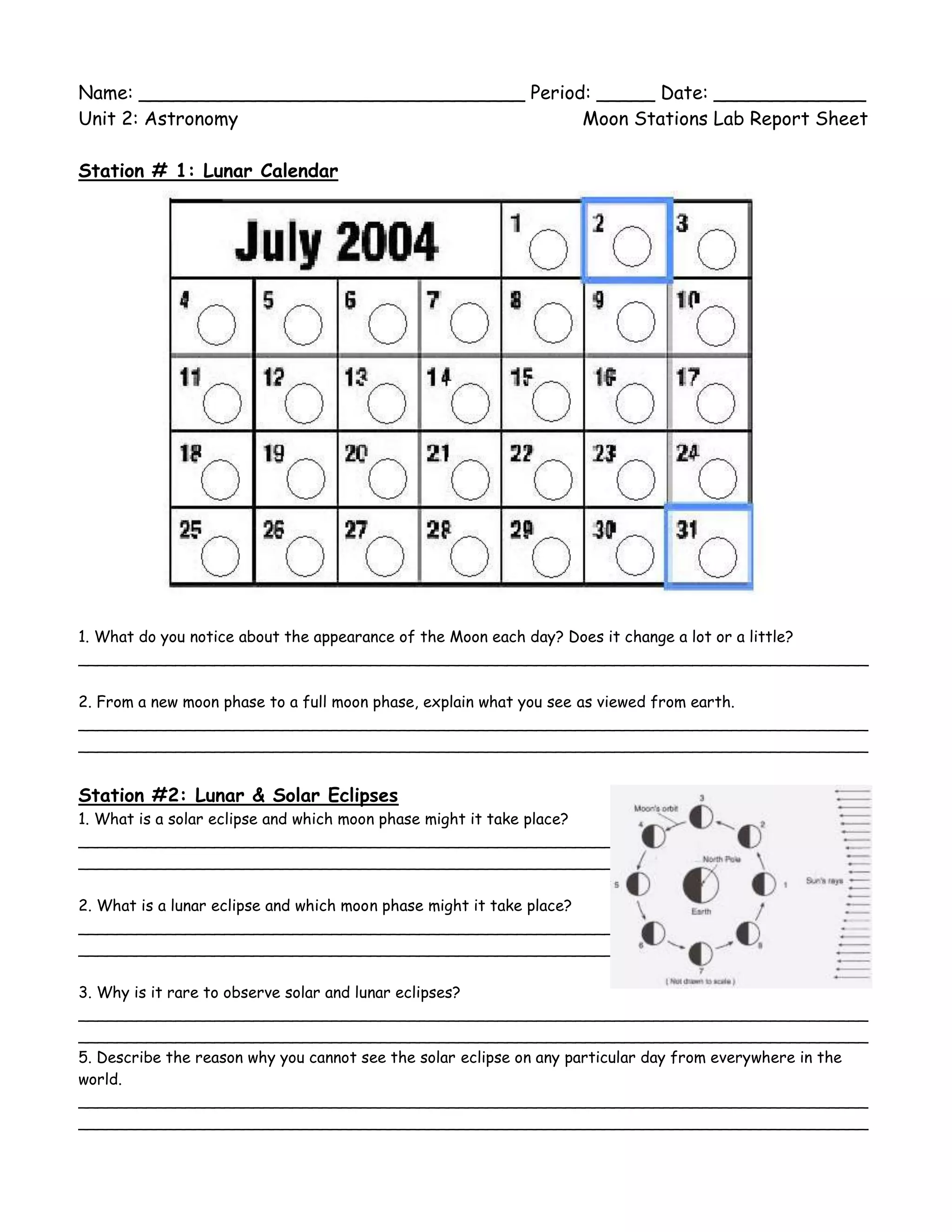 The document summarizes a lab report on astronomy and the moon. It includes 6 stations covering the lunar calendar, eclipses, moon phases, tides, viewing the moon during the day, and the impact theory of moon formation. Key findings are that the moon appears to change from new to full over days, solar eclipses occur during new moon and lunar eclipses during full moon, and tides are caused by the moon's gravity and affect by moon phases.