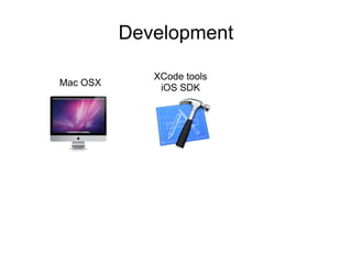 The document outlines the development process for iOS applications using Xcode tools and the iOS SDK, highlighting the requirements for Apple developer accounts at $99/year and $299/year for enterprise distribution. It includes code snippets for native development in Objective-C and describes the application lifecycle methods. In addition, it addresses features like in-app purchases and push notifications.