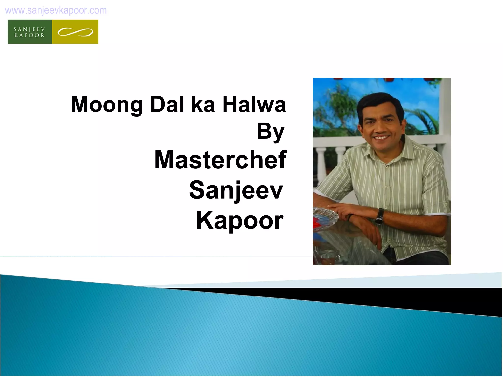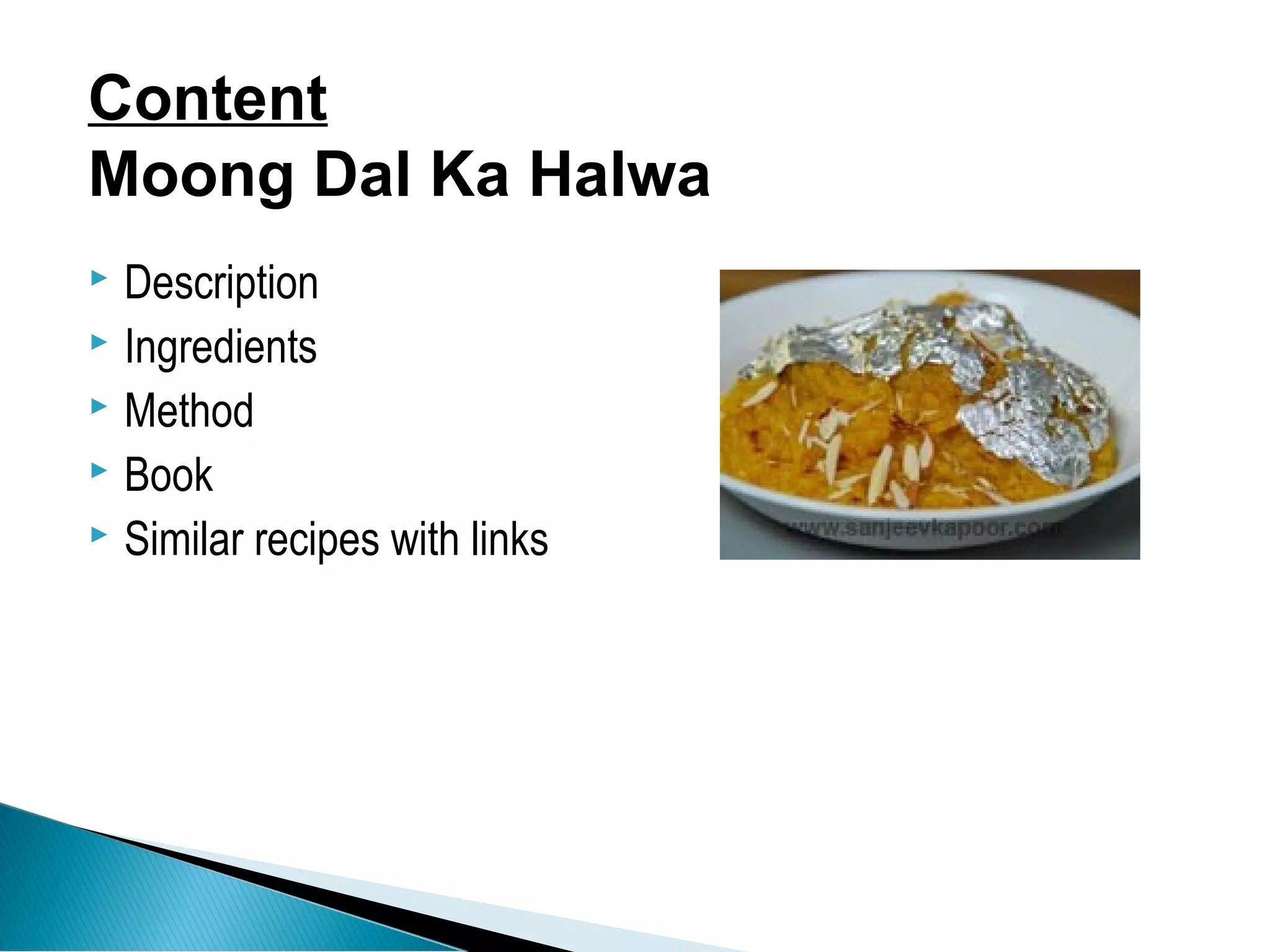 This document provides a recipe for Moong Dal ka Halwa from Masterchef Sanjeev Kapoor's website. The recipe calls for split green gram soaked and ground to a coarse paste, ghee, gram flour, milk, sugar, khoya/mawa, green cardamom powder, and almonds. It describes sautéing the moong dal in ghee until golden brown, combining it with saffron-infused milk, khoya, sugar syrup, and spices, then cooking it for 5 more minutes before serving garnished with edible silver foil. The document also lists similar sweet recipes and invites the reader to follow Sanjeev Kapoor on social media.