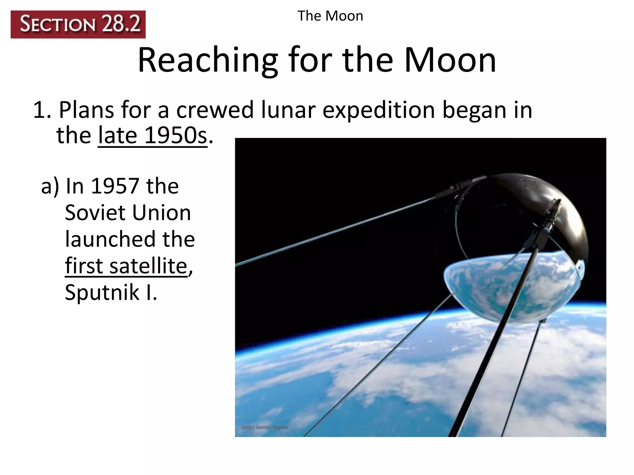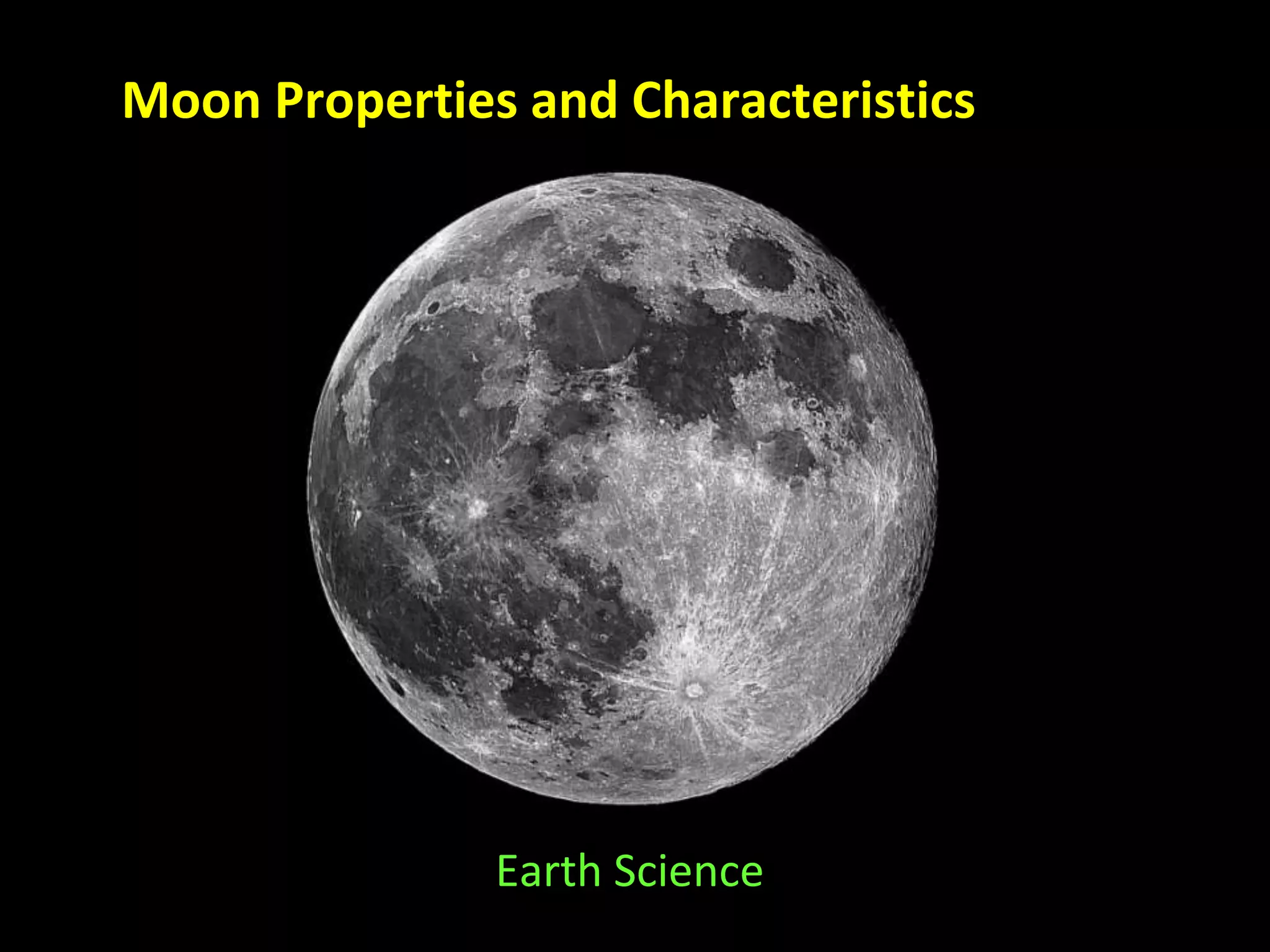 The document summarizes key facts about the Moon's properties, surface characteristics, composition and formation history. It discusses how lunar exploration began with Soviet and American space programs in the late 1950s and 1960s, culminating in the Apollo 11 mission landing in 1969. It describes the Moon's surface features like highlands, maria, impact craters and lack of atmosphere or water. The composition is similar to Earth, consisting mainly of silicates. The widely accepted theory is that the Moon formed from debris after a giant impact between Earth and a Mars-sized object over 4 billion years ago.