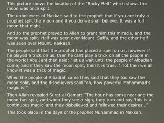 1) The document discusses a miracle mentioned in the Quran where the moon was split during the time of the Prophet Muhammad.