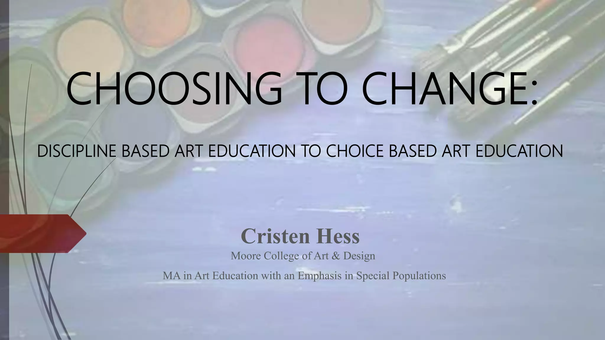 The document summarizes chapters 1-3 of a thesis on transitioning from a discipline-based art education approach to a choice-based art education approach in a 4th grade classroom. It describes some issues with the discipline-based model, such as students lacking enjoyment, confidence, and engagement. It discusses how choice-based art education allows students more freedom and ownership over their creative process. The researcher aims to see how choice-based art education can better support students' intrinsic motivations and sense of autonomy through their action research in their own 4th grade classroom.